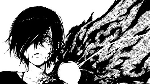 In a Koukaku type, the sac is located in the central area of the back. Koukaku types lack in speed what they gain in durability. These kagune typically appear in a shield-like formation and wraps around the arm.  They succeed against the quick Ukaku with their durability, but lose against the more offense-built Rinkaku.