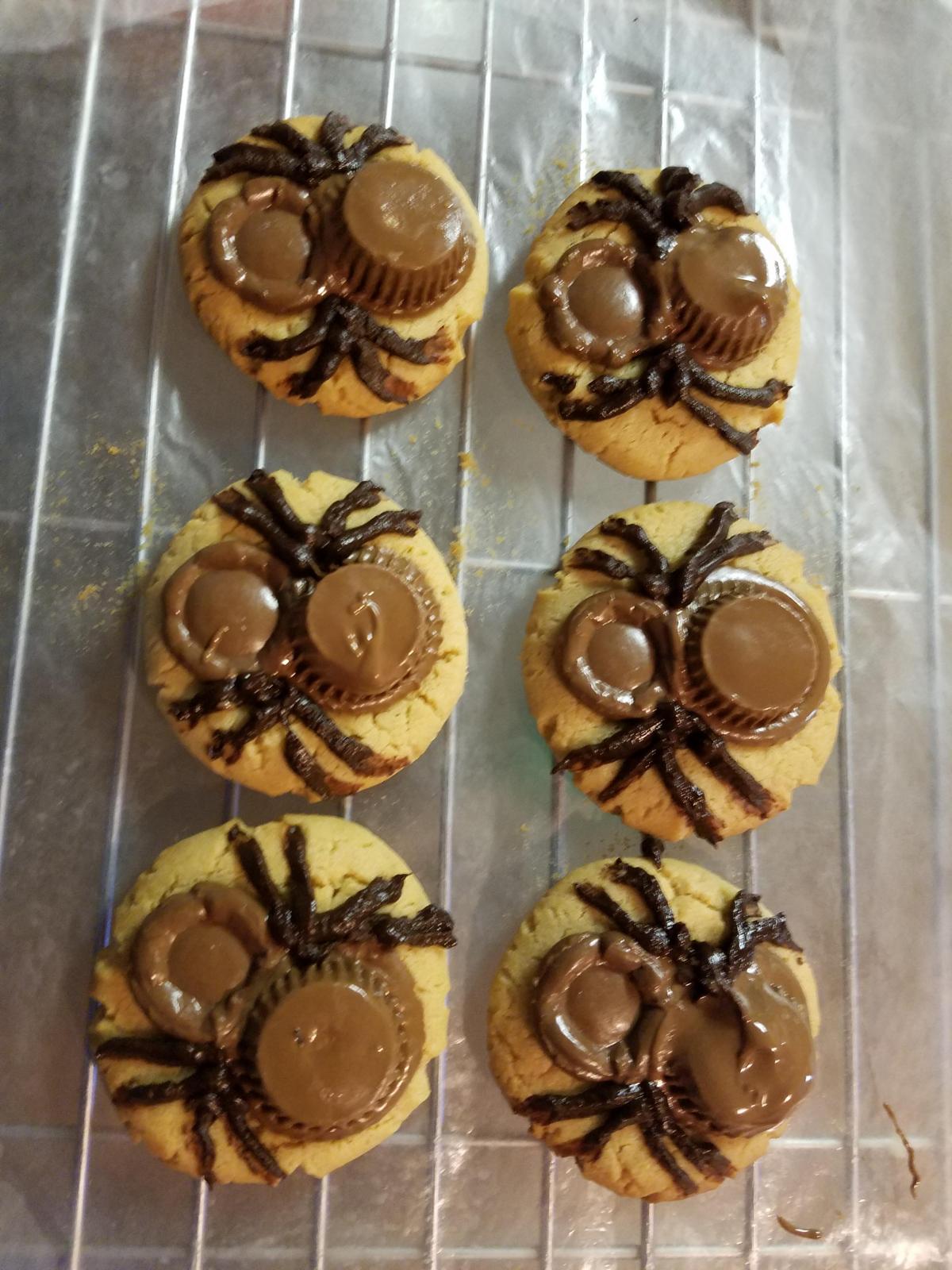 so i was making spider cookies, so you can see how they looked the last time i made them, that's the group of 6, but when i made them this time around as well as a bunch of pumpkin roll and brownies with some marshmallow mixed in, the bag i was using to pipe the chocolate legs exploded so i gave up, i am told they are still delicious